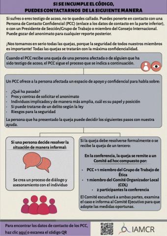 Si sufres o eres testigo de acoso, no te quedes callado. Puedes ponerte en contacto con una Persona de Contacto Confidencial (PCC) (enlace a los datos de contacto en la parte inferior), o con un Presidente de Sección/Grupo de Trabajo o miembro del Consejo Internacional. Puede gozar del anonimato para cualquier reporte posterior.