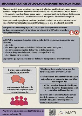 Si vous êtes victime ou témoin de harcèlement, n'hésitez pas à le signaler. Vous pouvez contacter une personne de contact confidentielle (CCP – « Confidential Contact Person ») — lien vers les coordonnées en bas de page — , un responsable de Section ou de Groupe de travail ou un membre du Conseil International. Vous pouvez demander l'anonymat.